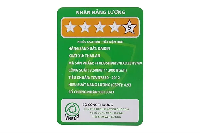| Hiệu suất năng lượng (COP/EER) | Khoảng 3.10 – 3.21 W/W (tùy chế độ) | Nhãn năng lượng 5 sao |